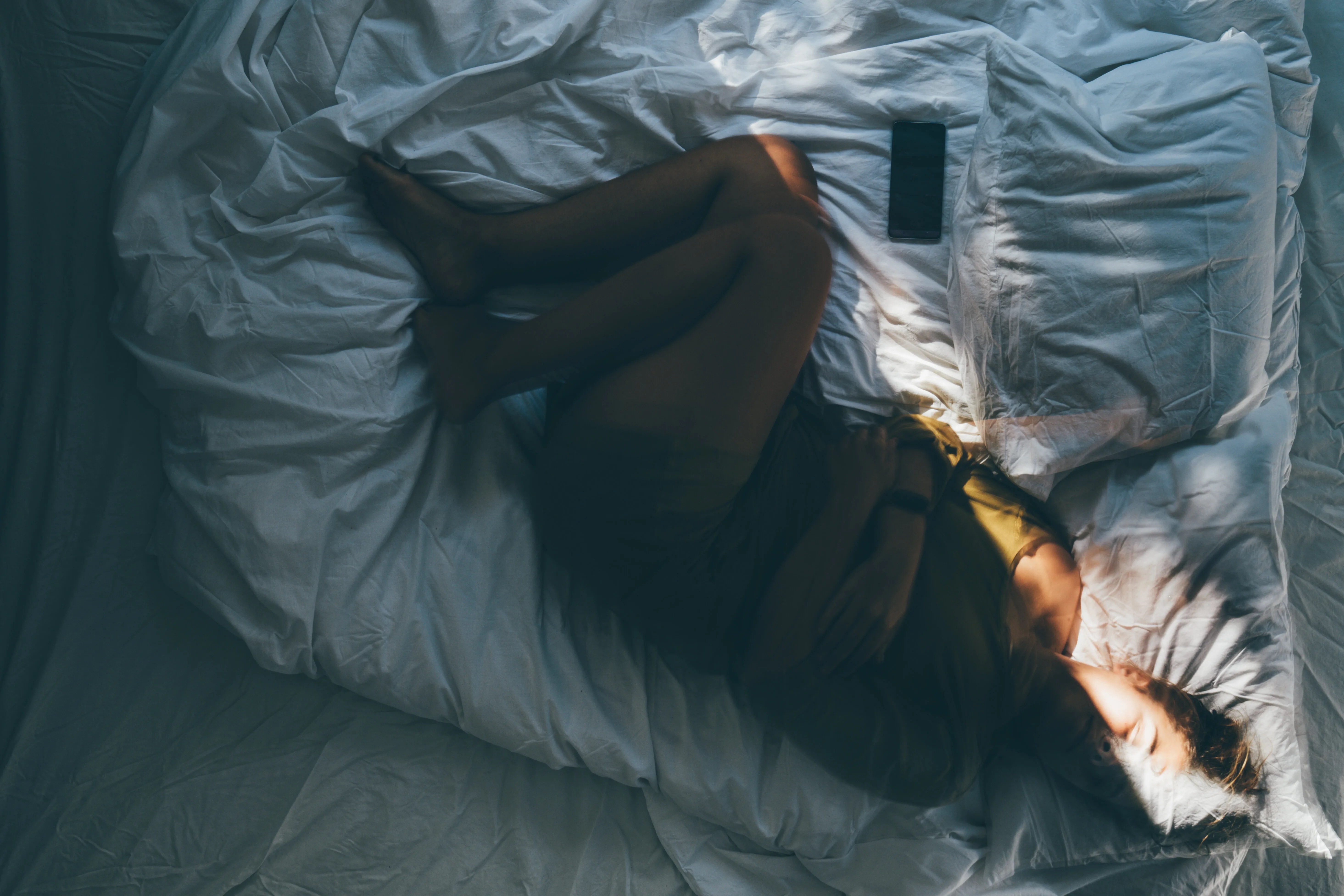 An overhead view of a woman curled up in bed, her smartphone resting next to her pillow. The dark, oppressive atmosphere and solitary pose evoke feelings of depression, mental health issues, and loneliness.